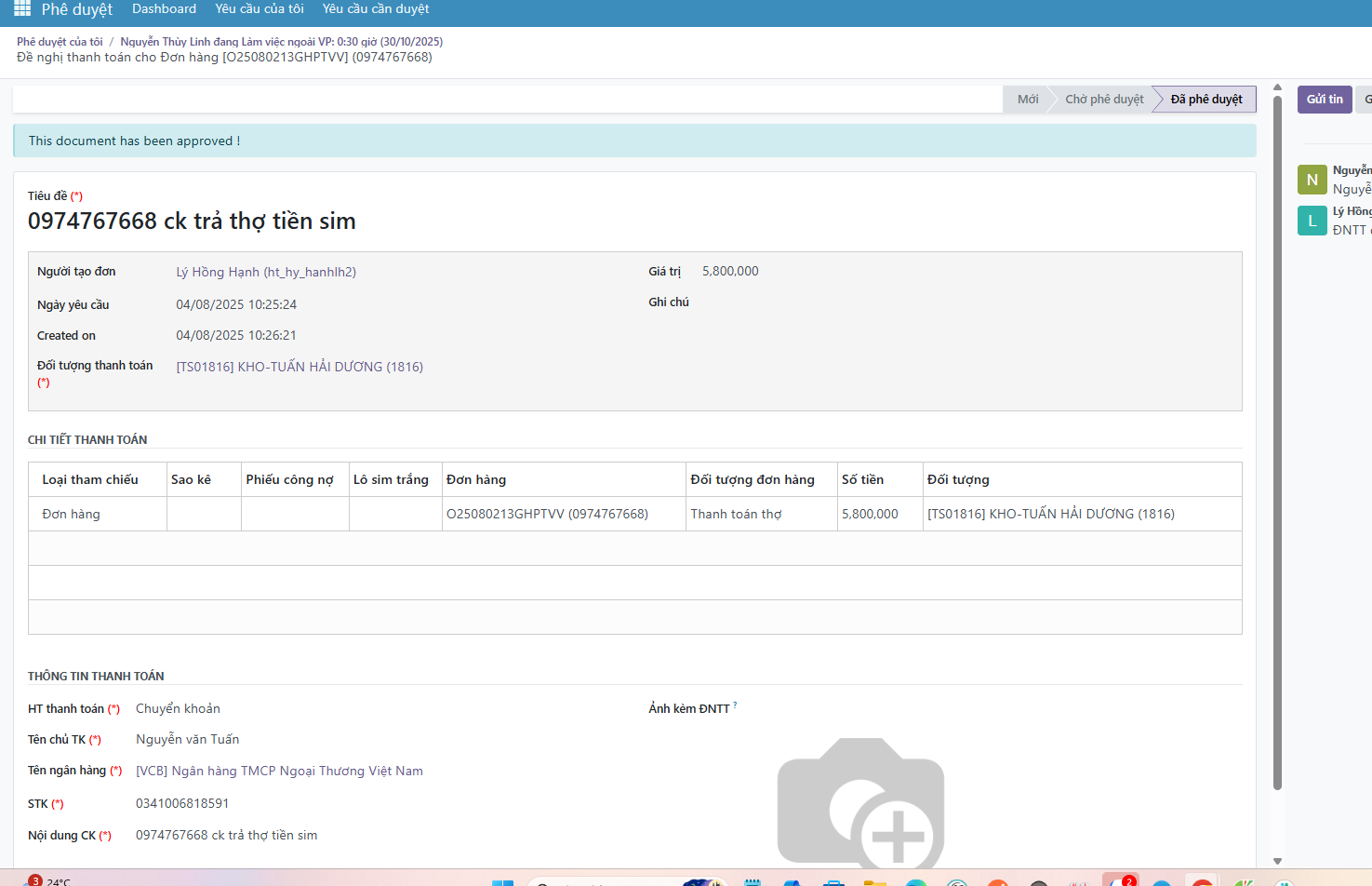 Đơn xin ra ngoài chị Linh nhưng bấm xem chi tiết lại ra phiếu thanh toán của nhân viên