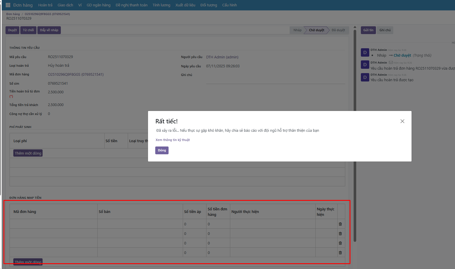 closedyêu cầu duyệt hoàn trả có các dong trống phần đơn hàng map tiền khi duyệt bị lỗi